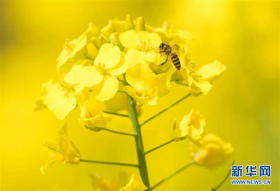 3月14日,在武汉市西北部市郊,蜜蜂在油菜花上采蜜。随着气温升高,春意在武汉的枝头上萌动,花朵渐次开放。新华社记者肖艺九摄