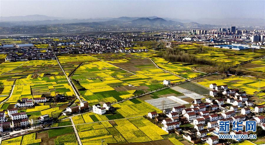 3月14日拍摄的洋县洋州街道何家村的油菜花海(无人机照片)。 新华社记者陶明摄