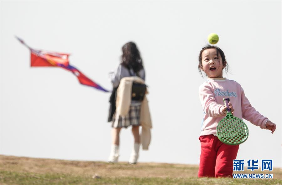 3月15日,一名小朋友在南京东郊体育公园练习儿童网球。 当日,南京风和日丽,市民们来到东郊体育公园,踏青春游。 新华社记者 杨磊 摄