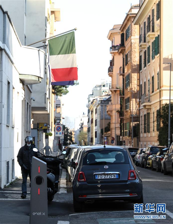 3月15日,在意大利首都罗马,一名男子戴着口罩出行。新华社记者程婷婷摄