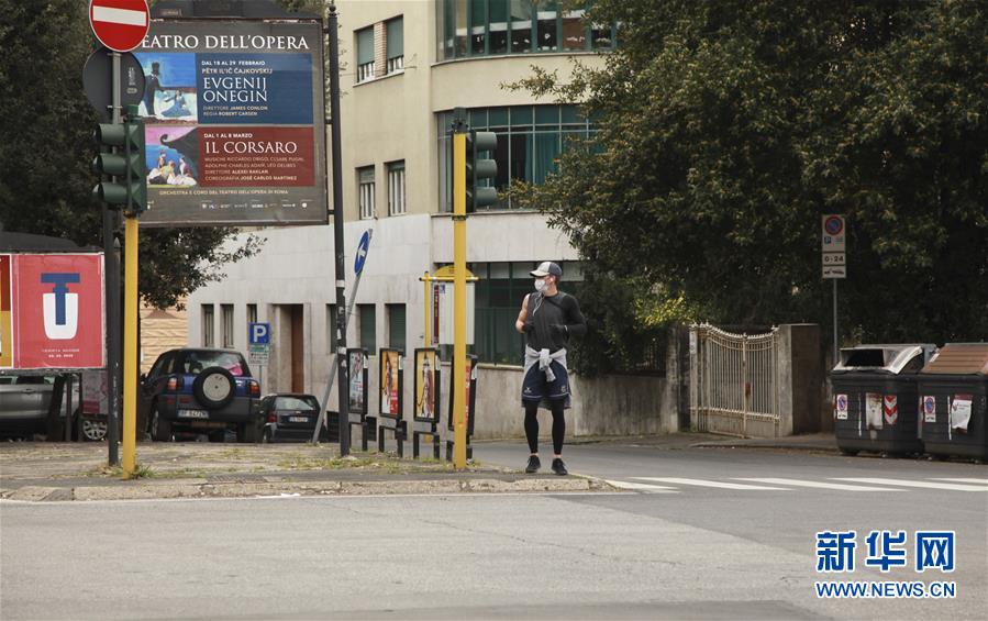 3月14日,在意大利首都罗马,一名男子戴着口罩跑步。新华社记者刘咏秋摄