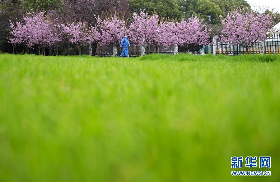 3月3日,一名工作人员从盛开的樱花树下走过。新华社记者费茂华摄