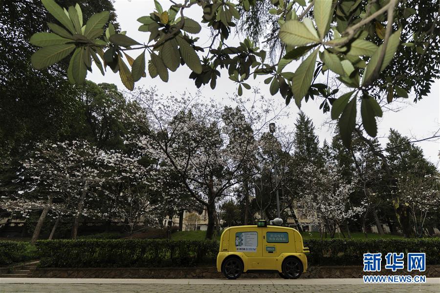 一辆5G无人摄像车在武汉大学樱花大道进行不间断无人巡游,实时采集和传输直播图像信号(3月16日摄)。新华社记者费茂华摄