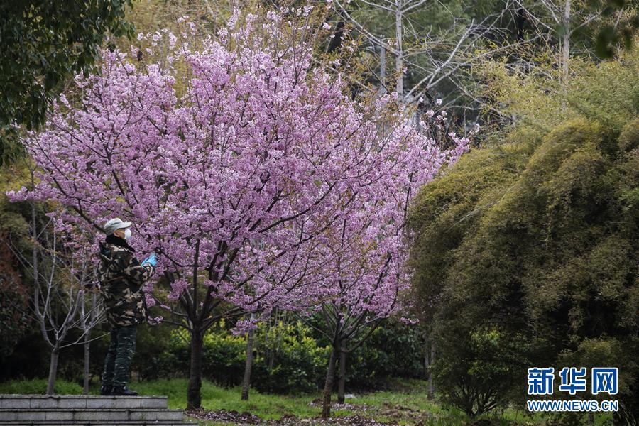 3月3日,一名工作人员在观赏盛开的樱花。新华社记者费茂华摄