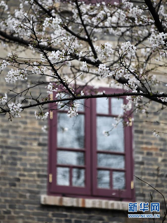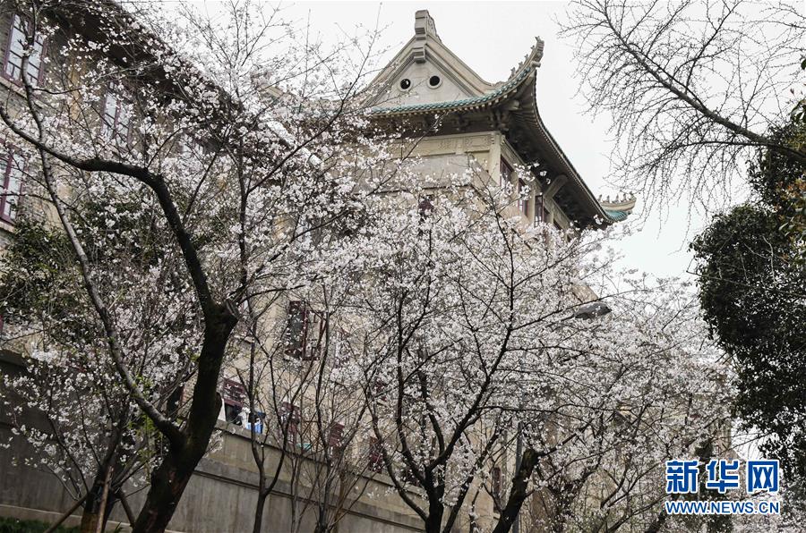 近日,随着气温上升,武汉大学图书馆附近一片樱花开放。新华社记者费茂华摄
