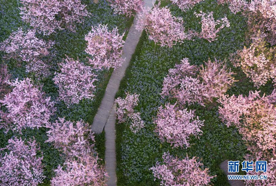 这是3月14日拍摄的武汉东湖磨山樱园景色(无人机照片)。近日气温渐升,武汉东湖磨山樱园里的樱花渐次盛开,带来春天的气息。新华社记者熊琦摄
