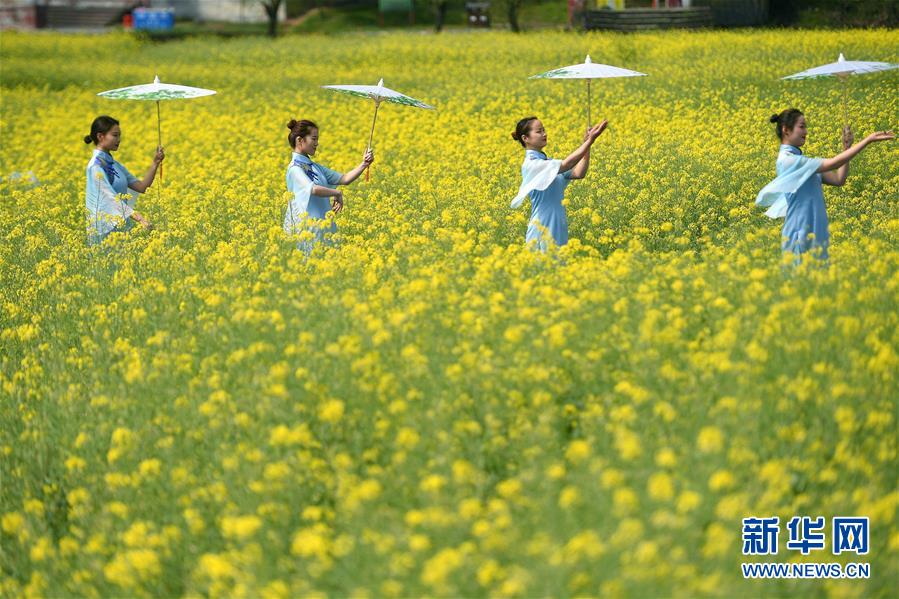 3月16日,演员在李坑村的油菜花田里表演。 新华社记者 万象 摄