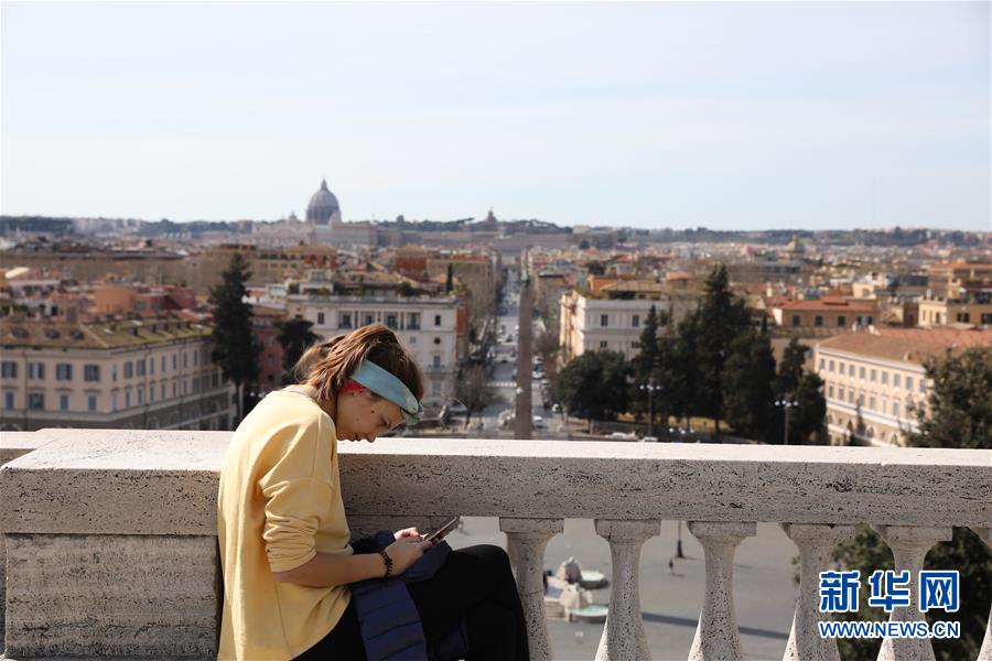 3月10日,在意大利首都罗马,一名女子在苹丘坐着休息。新华社记者程婷婷摄