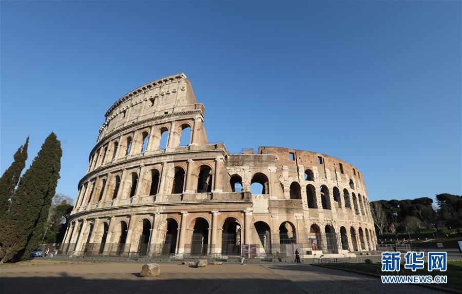 3月16日,在意大利首都罗马,两名警察在斗兽场外巡逻。新华社记者程婷婷摄