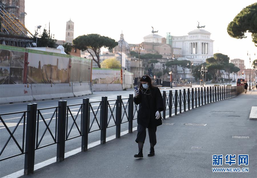 3月16日,在意大利首都罗马,一名女子戴着口罩出行。新华社记者程婷婷摄
