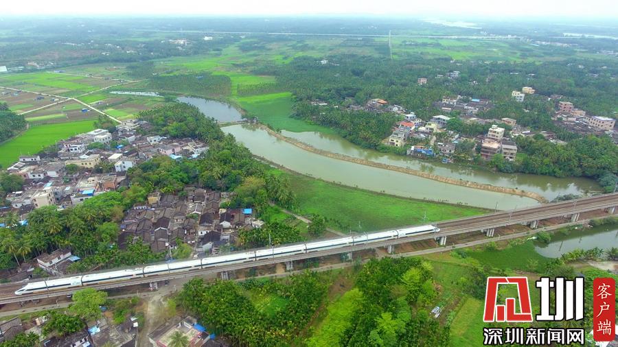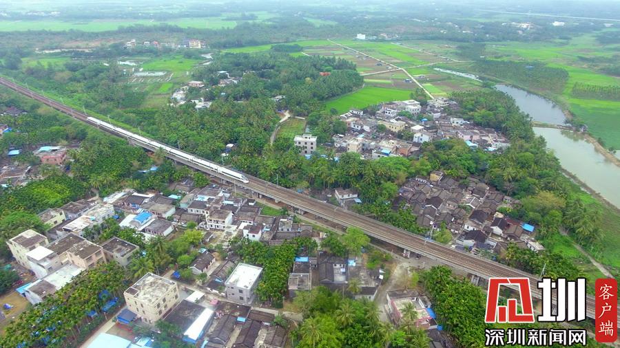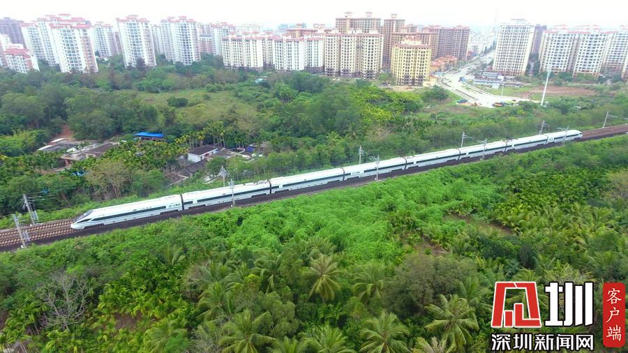 2020年3月17日,海南环岛铁路一列动车从春光明媚的琼海城区经过。