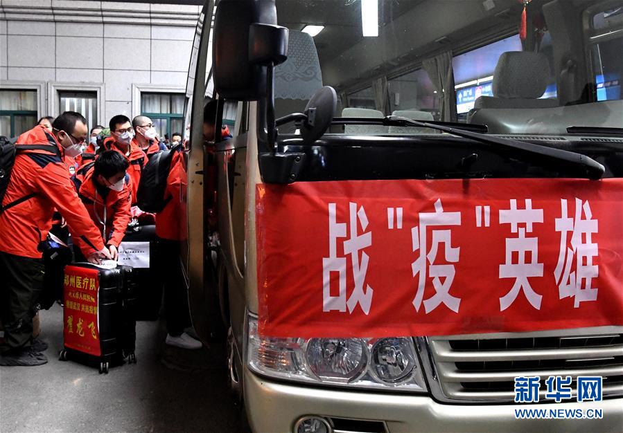 3月17日,医疗队队员在河南郑州东站乘坐大巴车。新华社记者李安摄