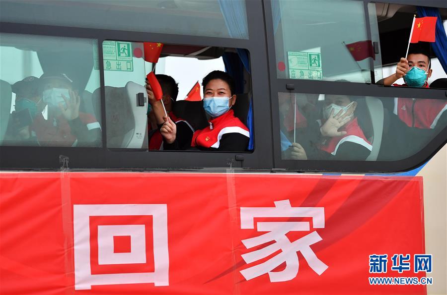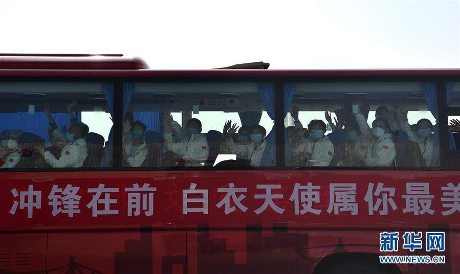 3月17日,在新疆乌鲁木齐地窝堡国际机场,医疗队队员坐上大巴车准备离开。新华社记者王菲摄