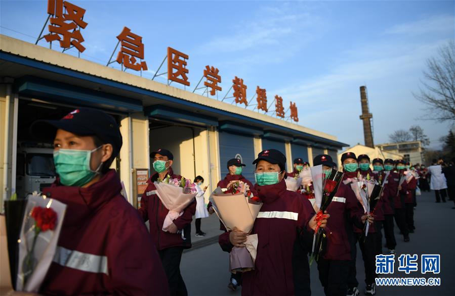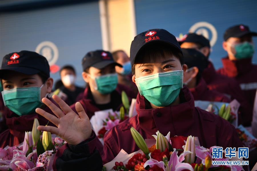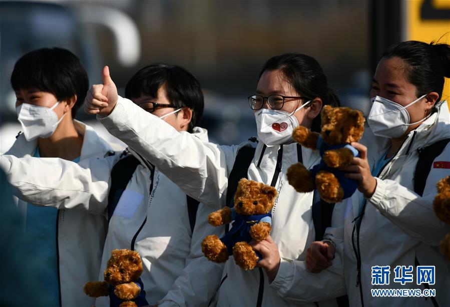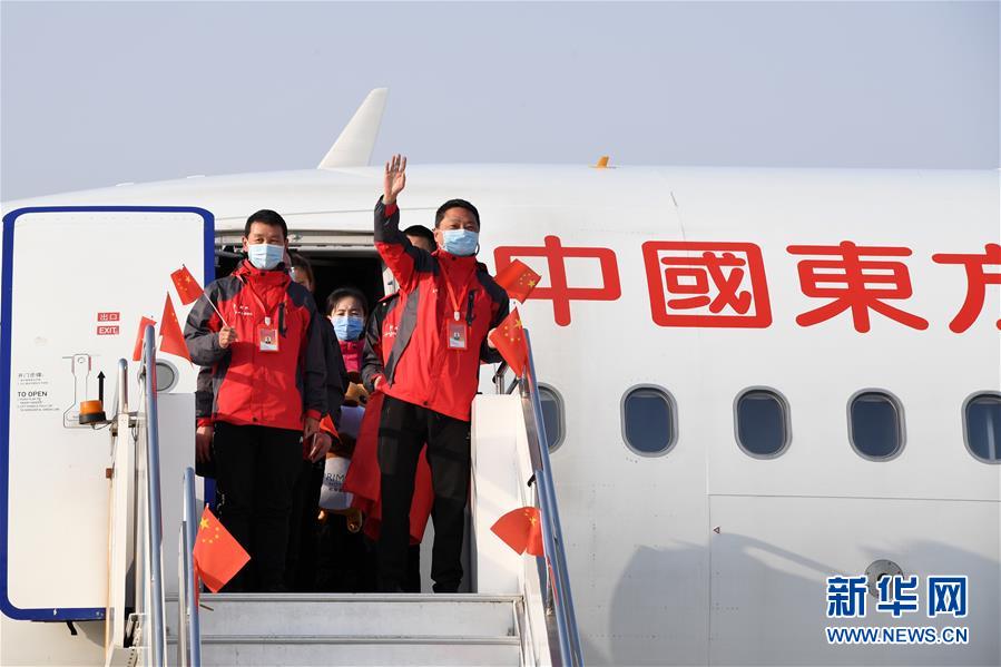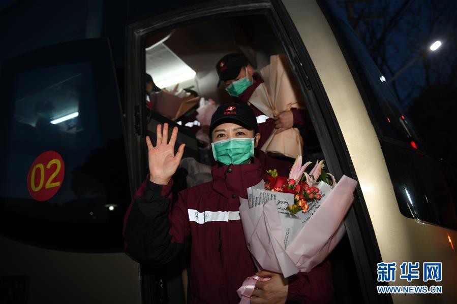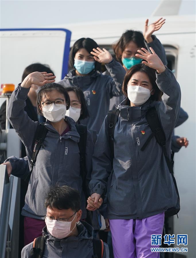 3月17日,抵达陕西西安的医疗队队员向前来迎接的人员挥手致意。新华社记者李一博摄