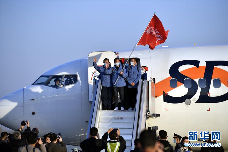 3月17日,医疗队队员抵达山东济南遥墙国际机场。新华社发(饶琦摄)