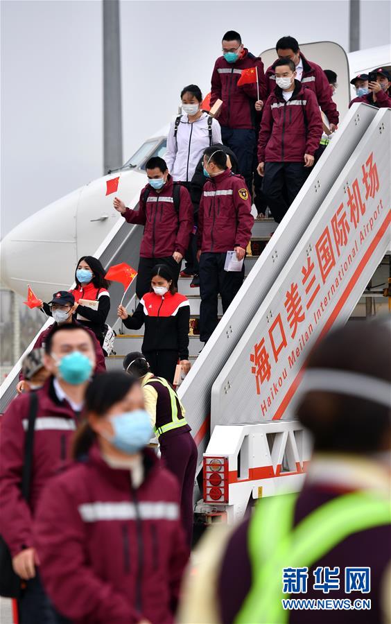 3月17日,医疗队队员抵达海南海口美兰国际机场。新华社记者郭程摄