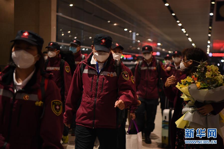 3月17日,在江苏南京禄口国际机场,医疗队队员参加欢迎仪式。新华社记者季春鹏摄