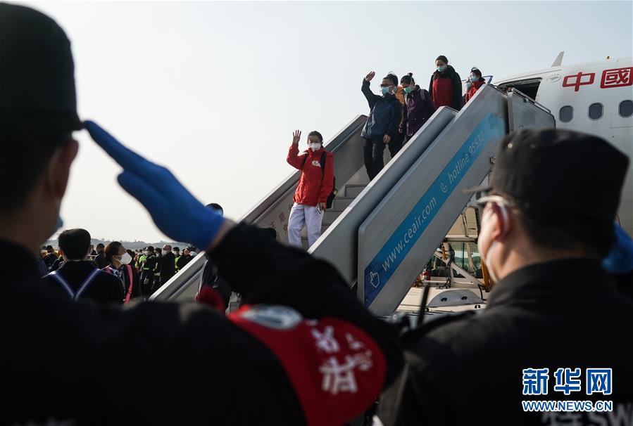 3月17日,在江苏南京禄口国际机场,医疗队队员向前来接机的人们挥手致意。新华社记者季春鹏摄