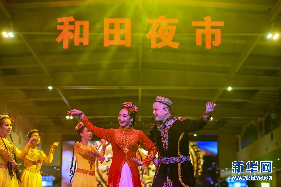 3月16日,在和田夜市环湖店,舞蹈演员表演节目。新华社记者 赵戈 摄