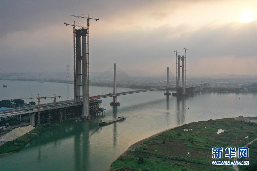 3月18日拍摄的广州南沙港铁路跨西江斜拉桥主塔封顶施工现场(无人机照片)。当日,中铁十一局承建的粤港澳大湾区重点工程——广州南沙港铁路跨西江斜拉桥主塔封顶,大桥整体建设取得重要进展。该桥位于广东佛山市和江门市交界处,全长1117.5米。新华社记者刘大伟摄