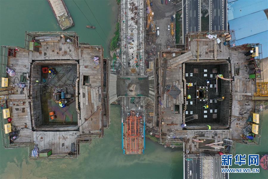 3月18日拍摄的广州南沙港铁路跨西江斜拉桥主塔封顶施工现场(无人机照片)。新华社记者刘大伟摄