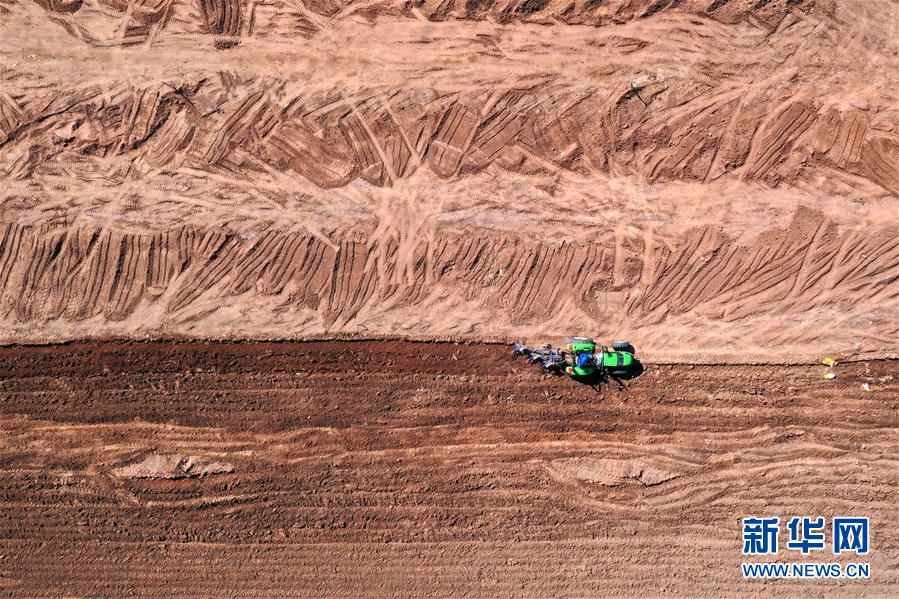 3月18日,在中国铁路太原局集团有限公司新创云竹生态农业园,农民在用农机犁地(无人机照片)。新华社记者 曹阳 摄
