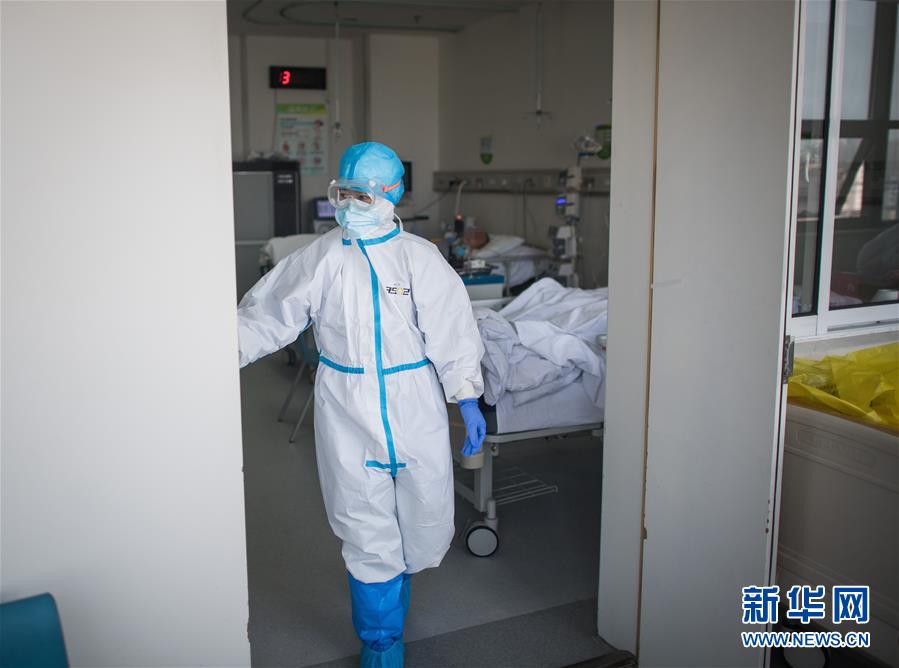 3月19日,在武汉市肺科医院隔离病房,海南医疗队队员在现场忙碌。 新华社记者 肖艺九 摄