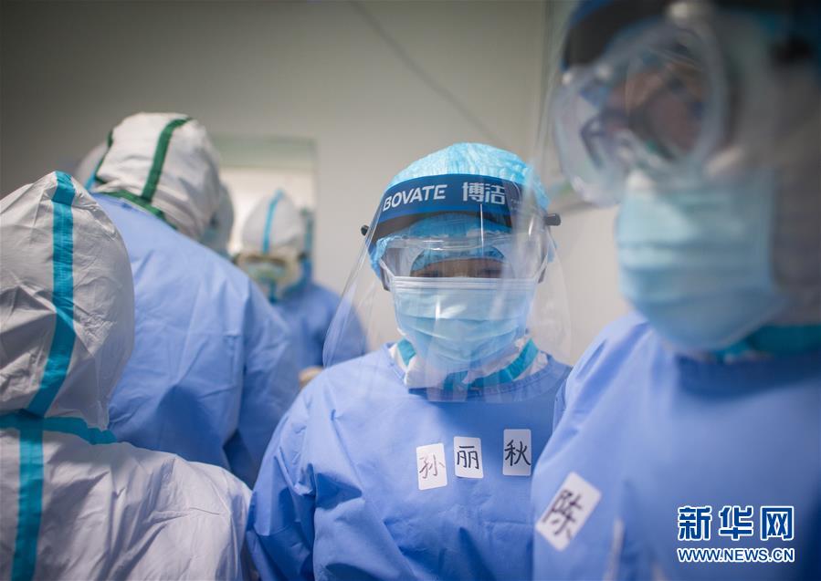 3月19日,在武汉市肺科医院清洁区,浙江医疗队队员孙丽秋(中)在穿戴防护服。 新华社记者 肖艺九 摄