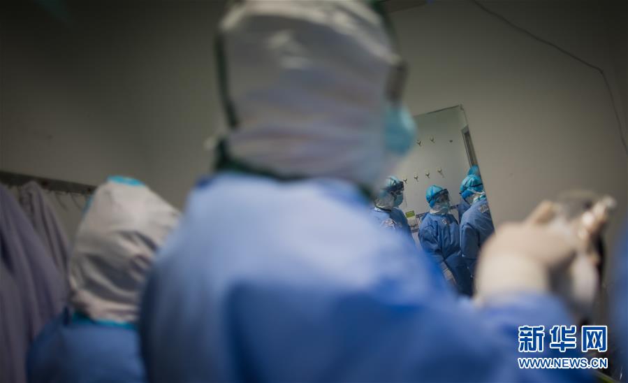 3月19日,在武汉市肺科医院清洁区,浙江医疗队队员在穿戴防护服。 新华社记者 肖艺九 摄