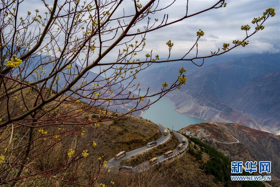 搬家的车队行驶在金沙江畔的盘山公路上,江对岸是四川省金阳县(3月15日摄)。 新华社记者 江文耀 摄