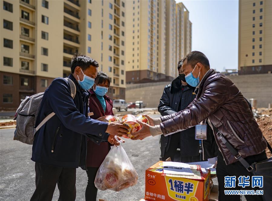 云南省永善县大兴镇骆丘村村民晏付高(左一)和妻子王大香(左二)抵达鲁甸县卯家湾,当地政府为每一户抵达的老百姓都准备了当日所需的生活用品(3月15日摄)。 新华社记者 江文耀 摄