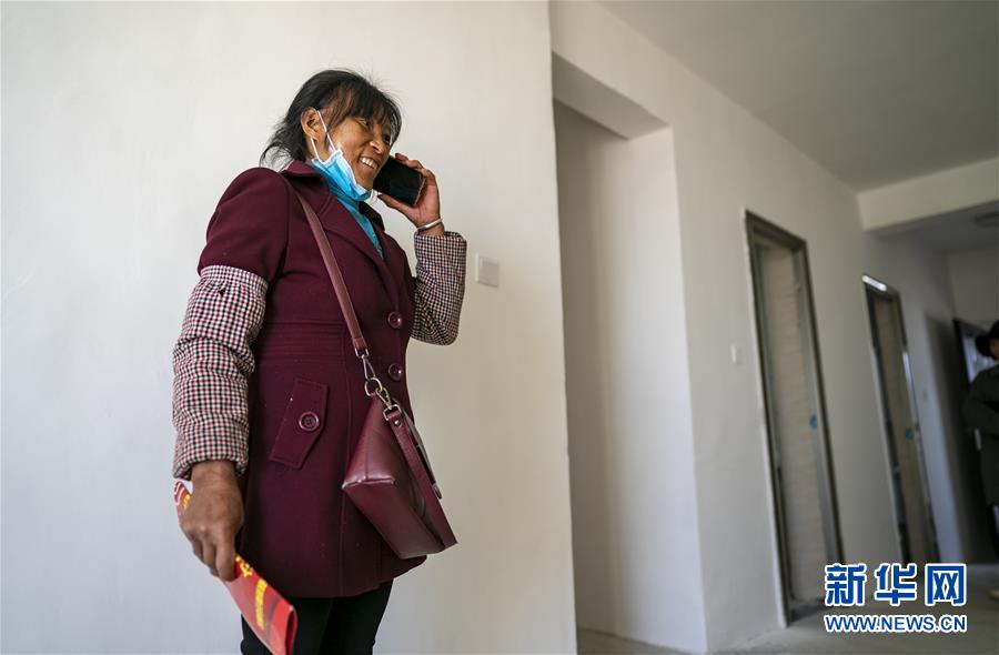 第一次进到新家的王大香给亲戚们打电话报喜(3月15日摄)。 新华社记者 江文耀 摄