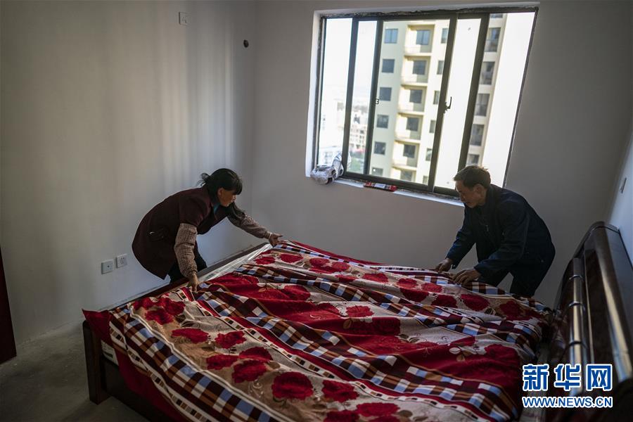 王大香和丈夫晏付高在新家铺床(3月15日摄)。 新华社记者 江文耀 摄