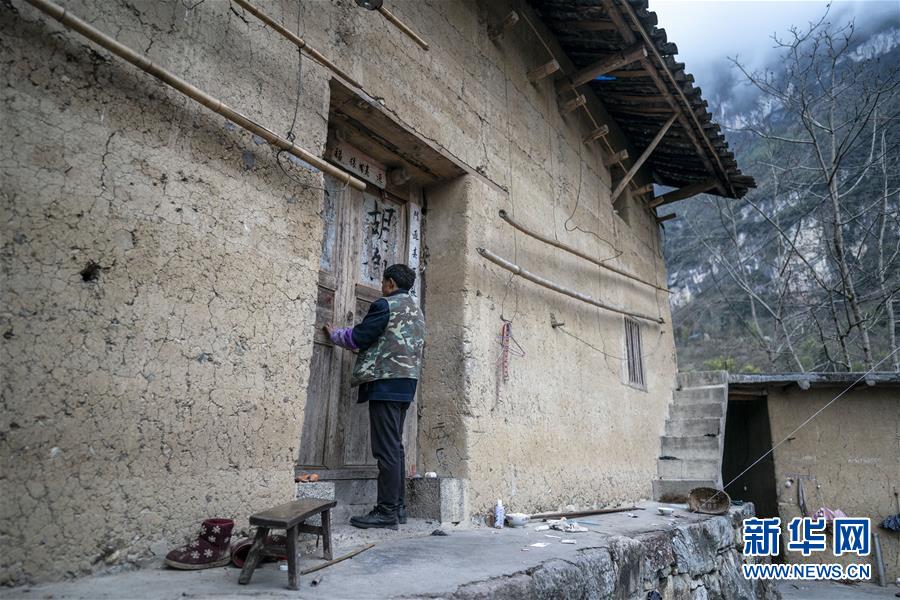 云南省永善县大兴镇骆丘村村民晏付高关上老屋的大门准备离开(3月14日摄)。 新华社记者 江文耀 摄
