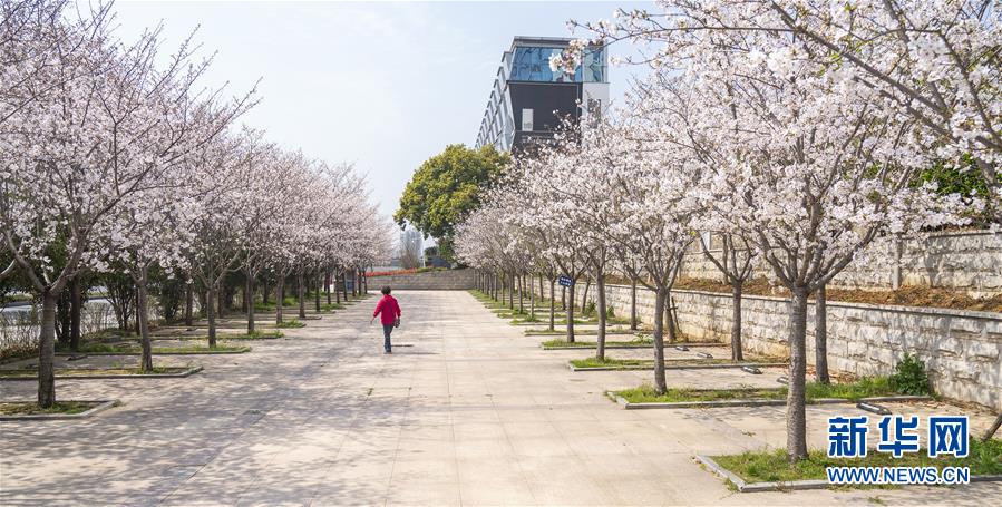 3月19日,在武汉市武昌区被网友称为“武汉最美停车场”的湖北日报停车场,一名工作人员从樱花树边经过。 新华社记者 才扬 摄
