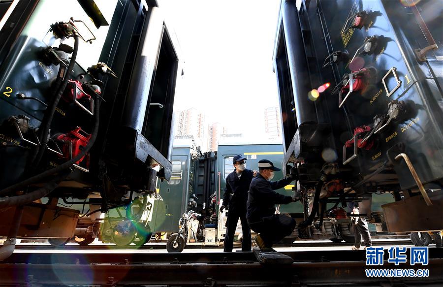3月19日,郑州车辆段客车检车员在对车钩进行状态记录和测量。新华社记者 李安 摄