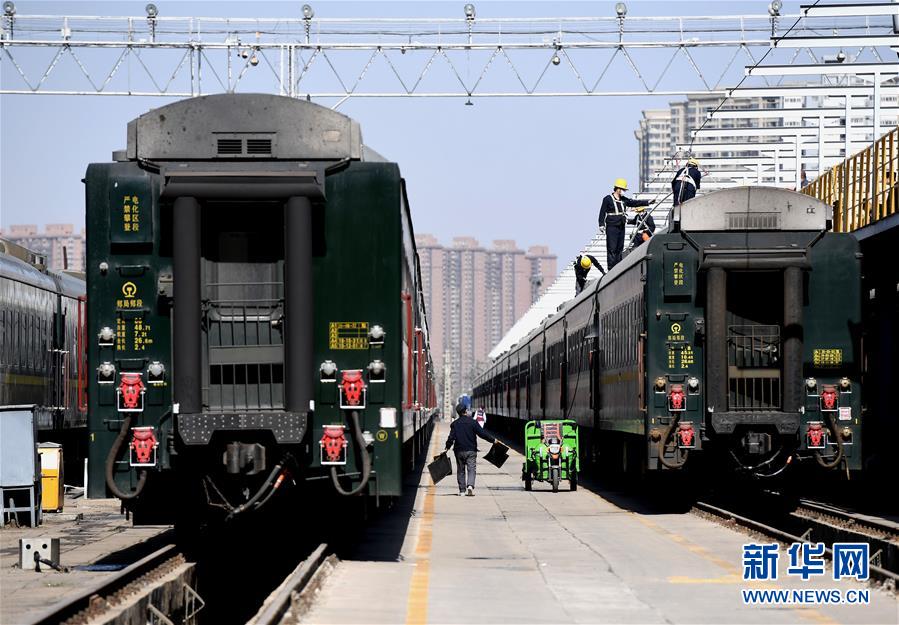 3月19日,郑州车辆段客车检车员在对客车空调机组进行检修作业。新华社记者 李安 摄
