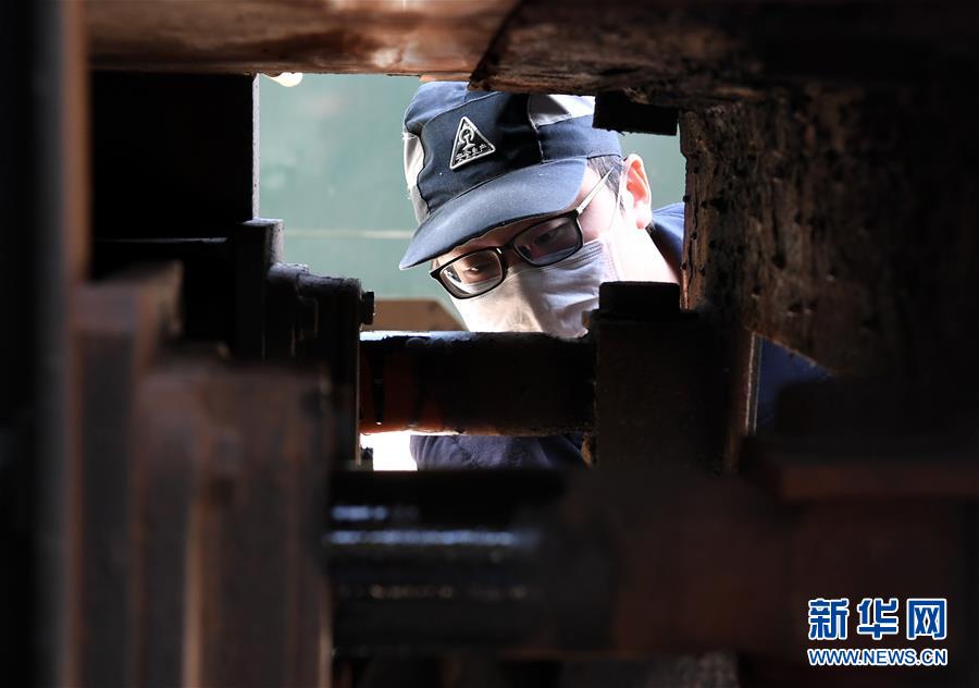 3月19日,郑州车辆段客车检车员在检查客车车钩钩身。新华社记者 李安 摄