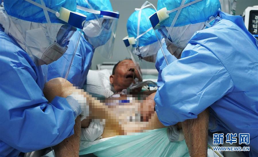 四名护士一起调整患者的身体姿态(3月20日摄)。 武汉火神山医院重症医学一科的护理团队共50名护士,其中绝大多数是80后、90后女性,她们不惧危险,奋战在抗击疫情的最前沿“红区”。 新华社记者王毓国摄