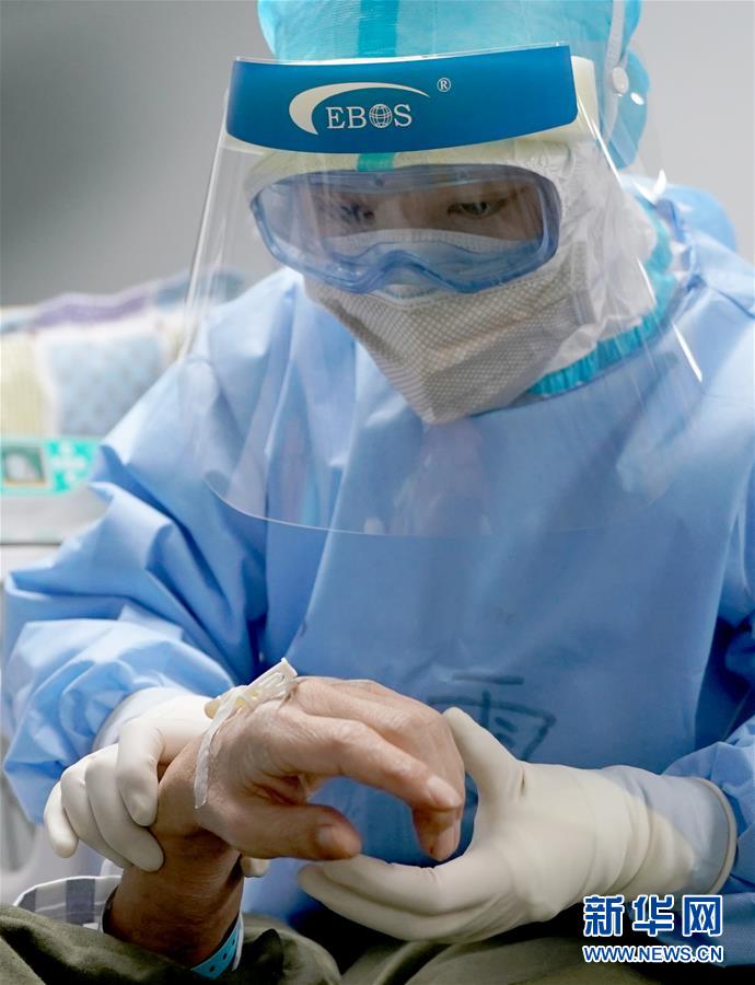 80后护士仲雅为患者进行口腔护理(3月20日摄)。 武汉火神山医院重症医学一科的护理团队共50名护士,其中绝大多数是80后、90后女性,她们不惧危险,奋战在抗击疫情的最前沿“红区”。 新华社记者王毓国摄