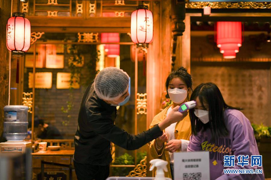 3月21日,在四川省成都市的一家火锅店门口,顾客在登记信息,接受体温检测。近日,在做好新冠肺炎疫情防控措施的基础上,四川省成都市的火锅店逐渐恢复营业。新华社记者唐文豪摄