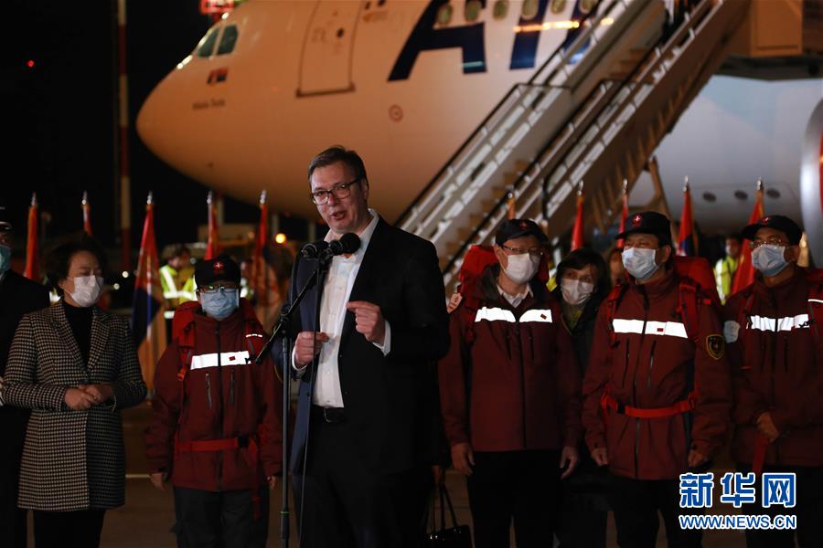 3月21日,在塞尔维亚首都贝尔格莱德,塞尔维亚总统武契奇在欢迎中国援助塞尔维亚抗疫医疗专家组的仪式上致辞。 中国援助塞尔维亚抗疫医疗专家组一行6人21日晚乘专机抵达塞首都贝尔格莱德,由中国政府捐赠的一批医疗物资同机抵达。 新华社记者 石中玉 摄