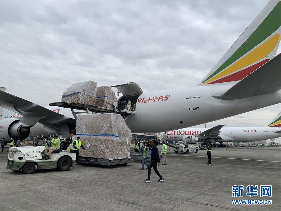 3月22日,在埃塞俄比亚首都亚的斯亚贝巴国际机场,工作人员将中国援助的抗疫物资运下飞机。历时10小时飞行,满载着来自中国抗疫物资的埃航货运包机22日上午抵达埃塞俄比亚首都亚的斯亚贝巴的国际机场,这是马云公益基金会和阿里巴巴公益基金会捐赠非洲的部分医疗物资,用于支援非洲54国抗击疫情。新华社记者王守宝摄