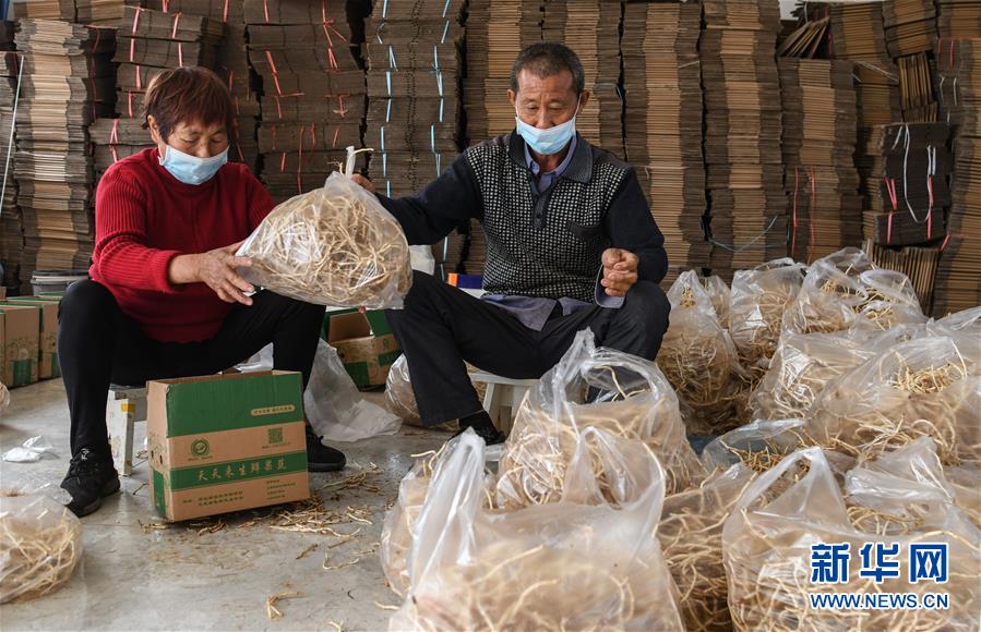 湖北当阳市坝陵办事处群华村村民宋发林(右)和妻子在农产品合作社包装产品,准备通过电商外销(3月21日摄)。近日,湖北当阳市农业生产和农产品加工加速恢复。截至3月19日,当阳市86家规上农产品加工企业复工复产率为84.9%,51家农业产业化重点龙头企业有48家复工复产,占比达94.1%。新华社记者程敏摄