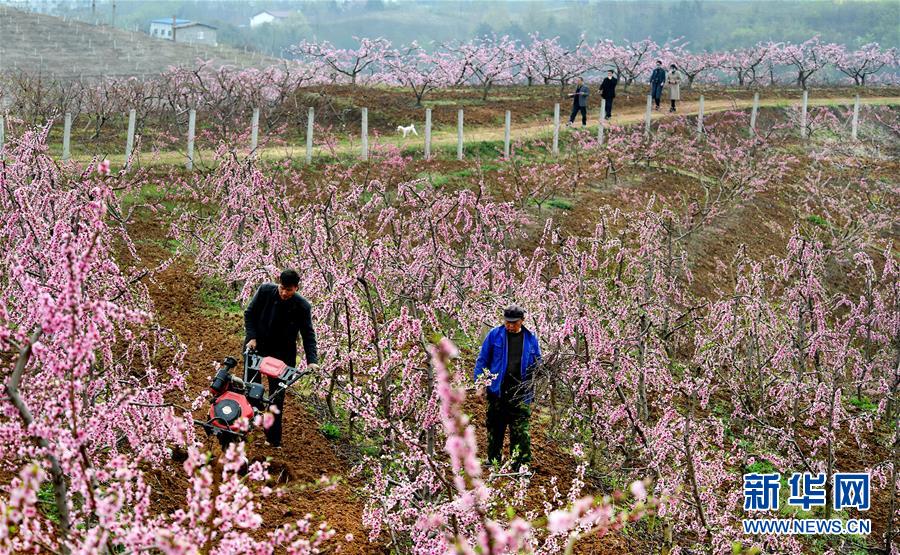 3月22日,龙亭镇柳山村村民(前)在桃园中春耕。阳春三月,陕西省汉中市洋县龙亭镇柳山村,1300亩桃园的花朵绽放。新华社记者陶明摄
