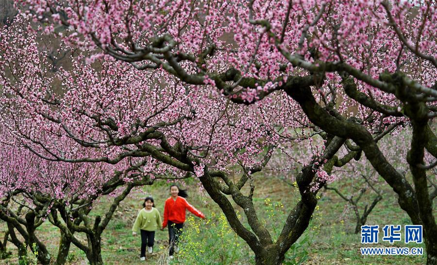 3月22日,两位小朋友穿行在柳山湖畔盛开的桃花丛中。阳春三月,陕西省汉中市洋县龙亭镇柳山村,1300亩桃园的花朵绽放。新华社记者陶明摄