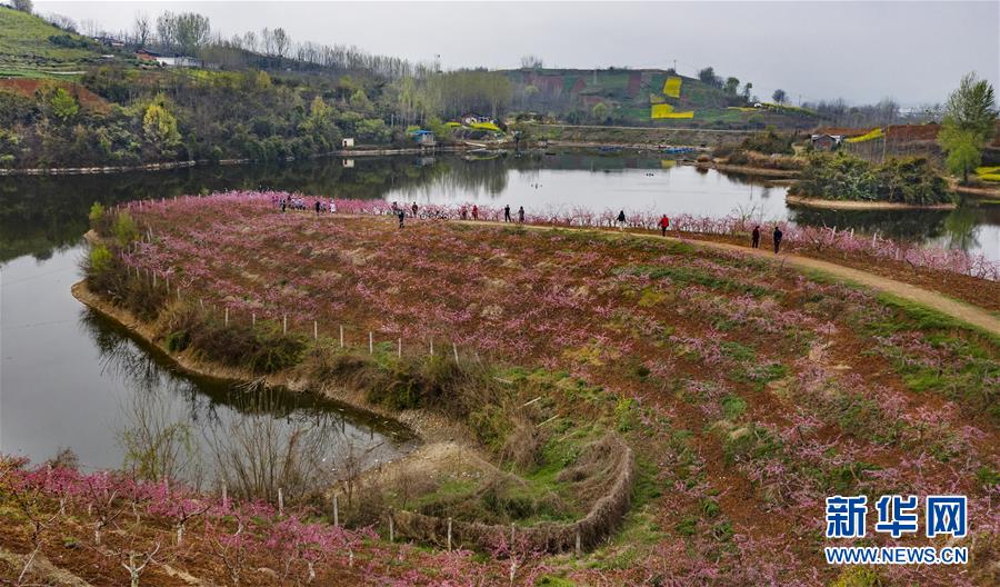 3月22日,游人在柳山湖的桃花岛上游览(无人机照片)。阳春三月,陕西省汉中市洋县龙亭镇柳山村,1300亩桃园的花朵绽放。新华社记者陶明摄