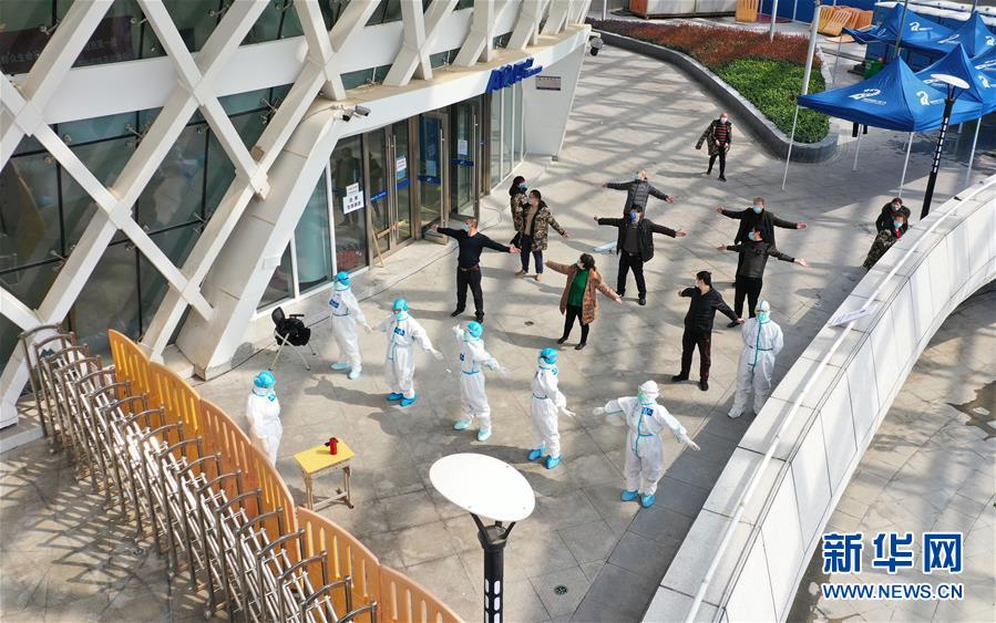 3月10日,在武汉江夏方舱医院,医护人员教患者练习八段锦(无人机照片)。新华社记者才扬摄