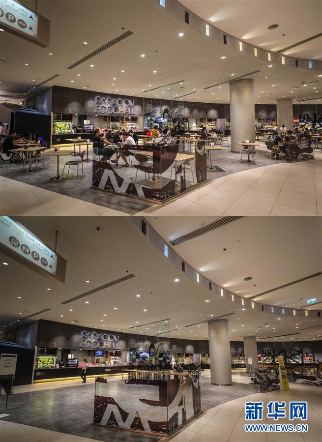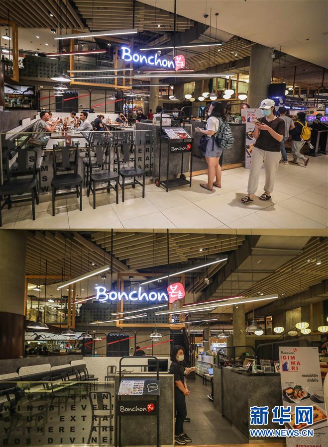 这是3月21日拍摄的泰国曼谷暹罗百丽宫商场负一层的美食城(上图)和3月22日拍摄的美食城对比图。商场除了负一层的美食城和超市外,全部关闭。美食城只对顾客提供外卖服务。新华社记者张可任摄