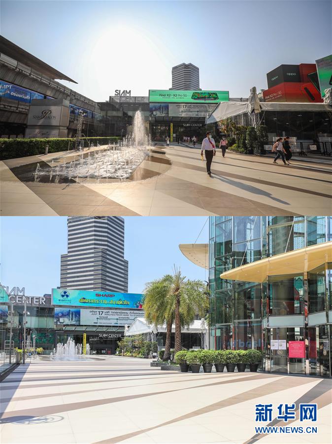 这是3月21日拍摄的泰国曼谷暹罗广场(上图)和3月22日拍摄的空无一人的广场的对比图。新华社记者张可任摄